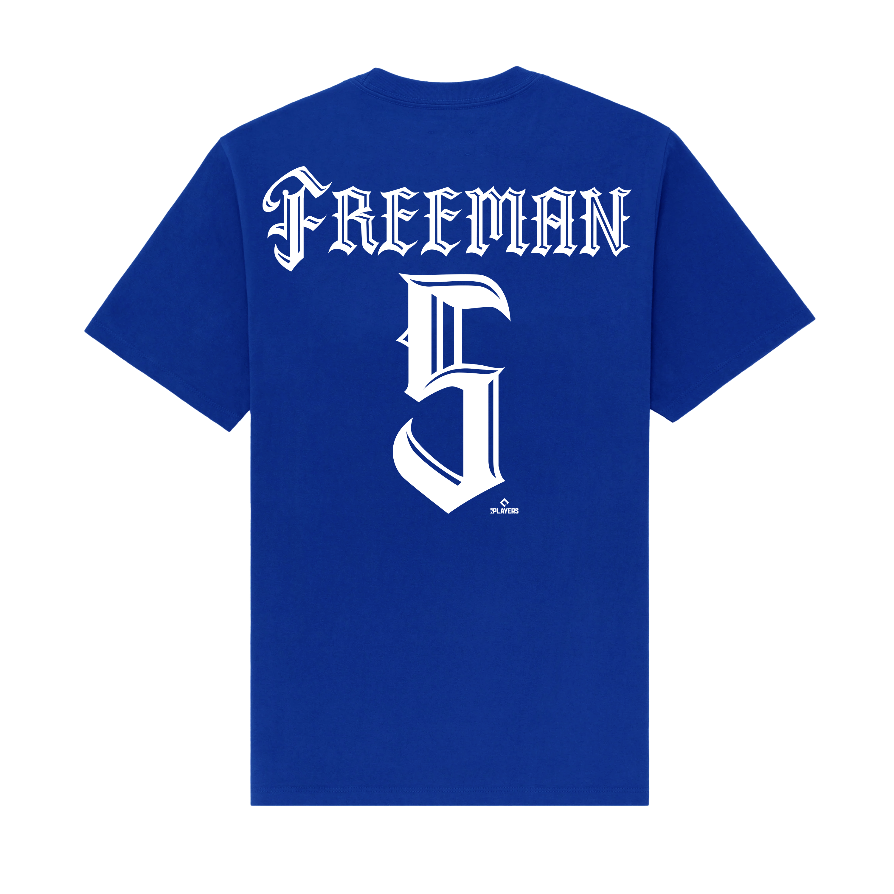A blue Nike tee featuring the iconic Mister Cartoon Logo, Freddie Freeman name and number redesigned by Mister Cartoon in a signature one of a kind font and style, with the traditional Dodger script on the chest.