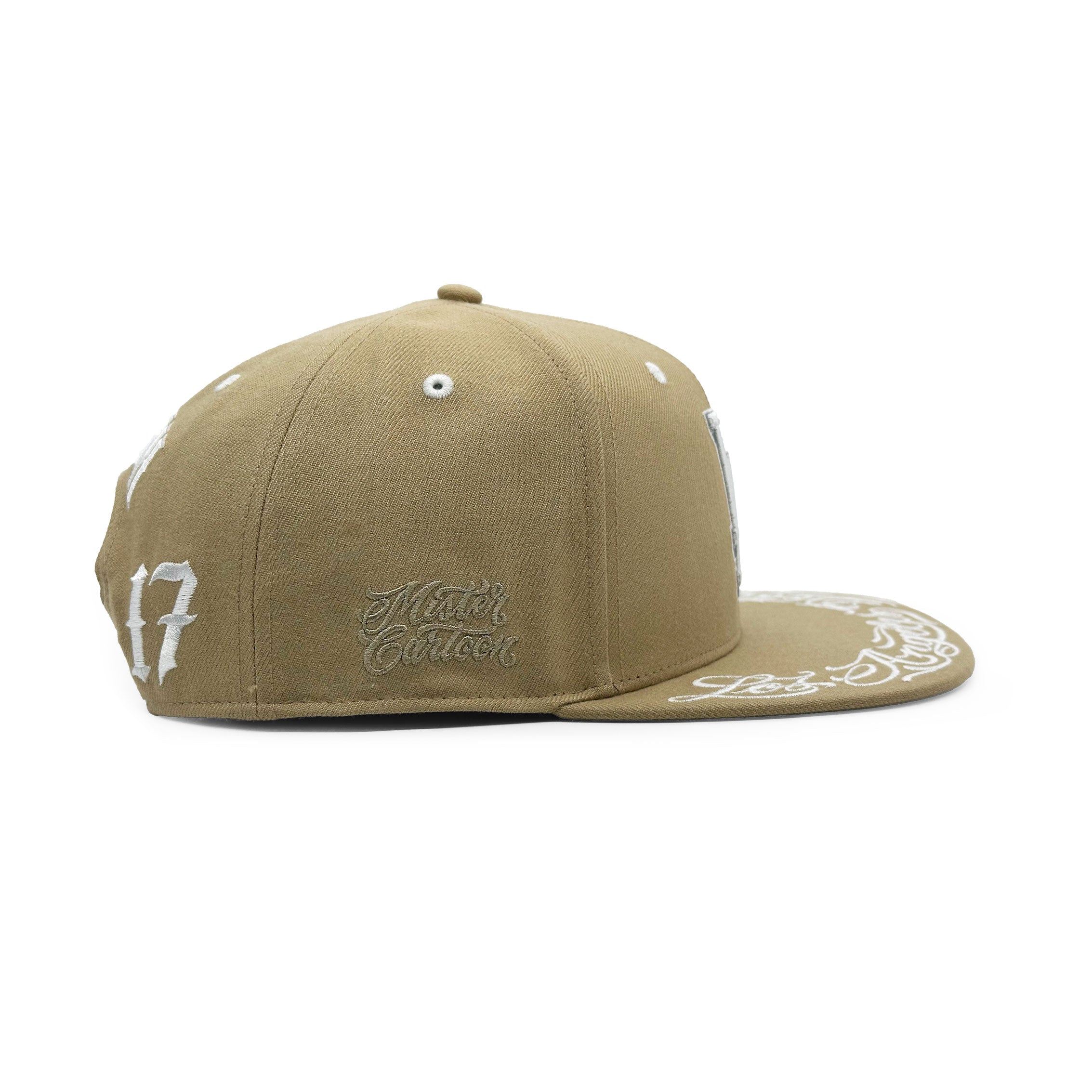 A native Angeleno, Cartoon’s distinctive, hand-rendered designs pull their inspiration from the city’s streets, and his custom elements are incorporated purposefully on this hat.